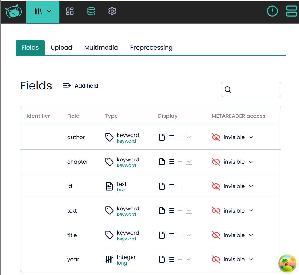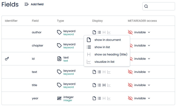 Instead of adding whole documents, you can also change fields in an index. Fields are similar to columns in a table in Excel. However, you need to define the type of a field upon its creation and make sure that you later only add data which adheres to the specifications of the type (otherwise you will get an error). To learn more about the fields in the test index, you can use:
