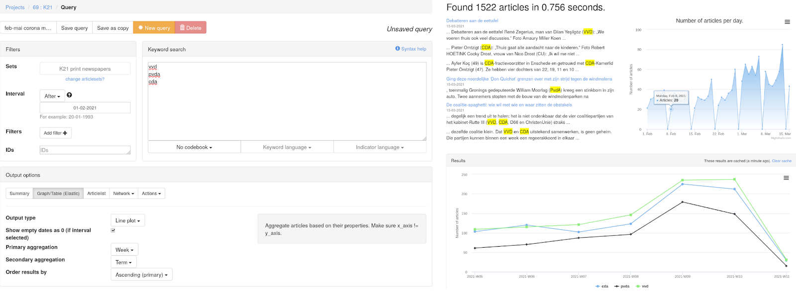 AmCAT has been in development in various guises since about 2001 as a text research / content analysis platform at the VU. From the start, the core has been a database of news articles, an API allows other programs and power users to connect to it directly from e.g. Python or R and an intuitive query interface for performing quantitative analysis. The screenshots below give some indication of the database and query interface of AmCAT 3.5.